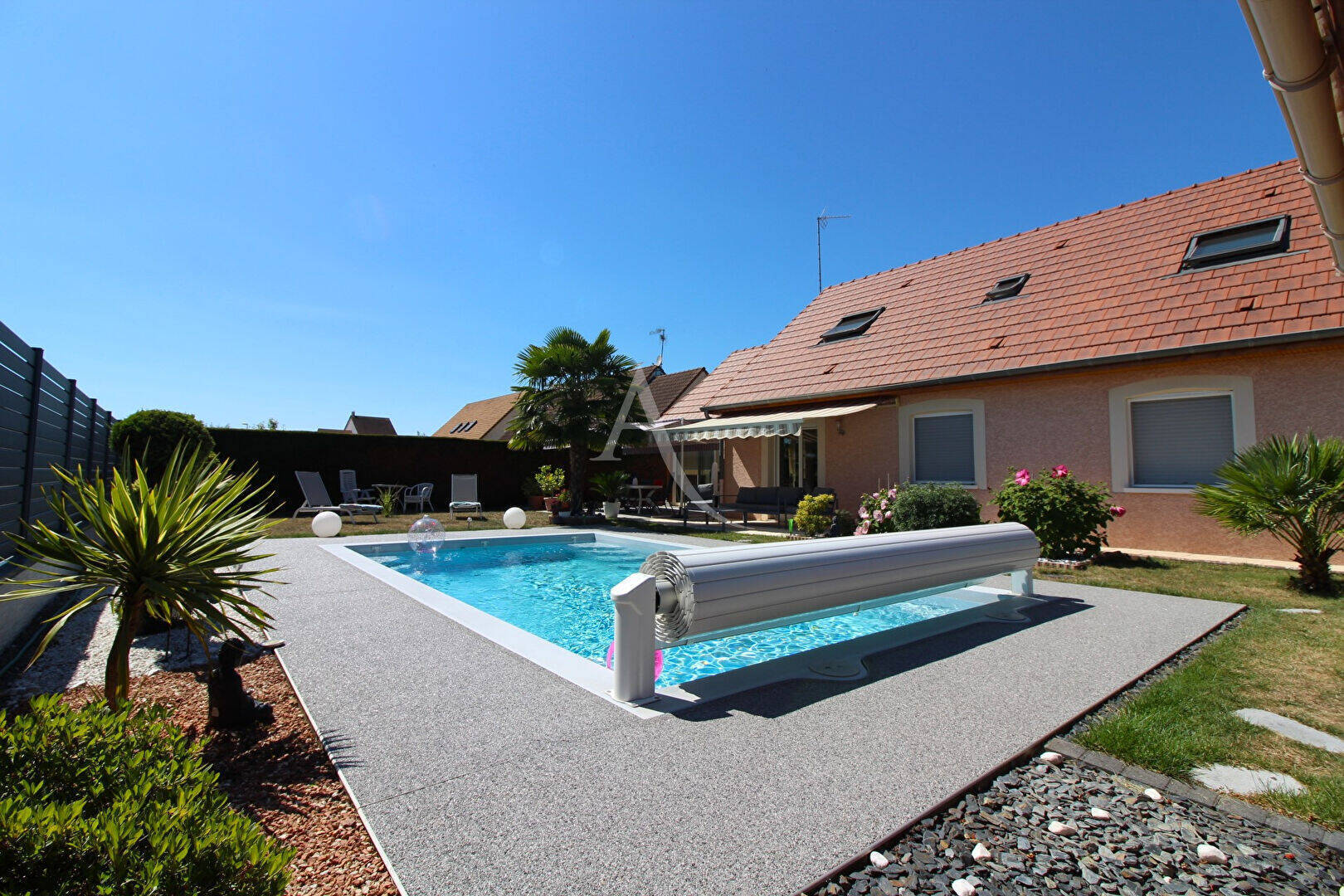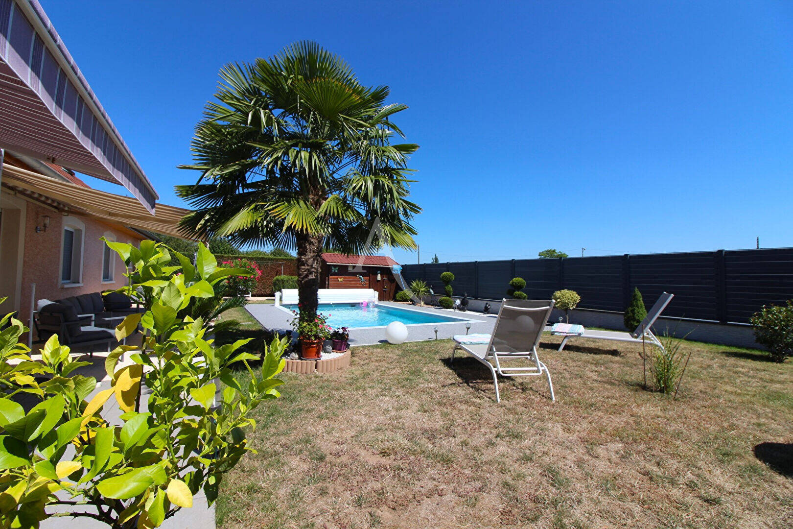implantée sur un terrain clos et paysagé de 800 m² sans vis-à-vis, elle offre de superbes extérieurs :